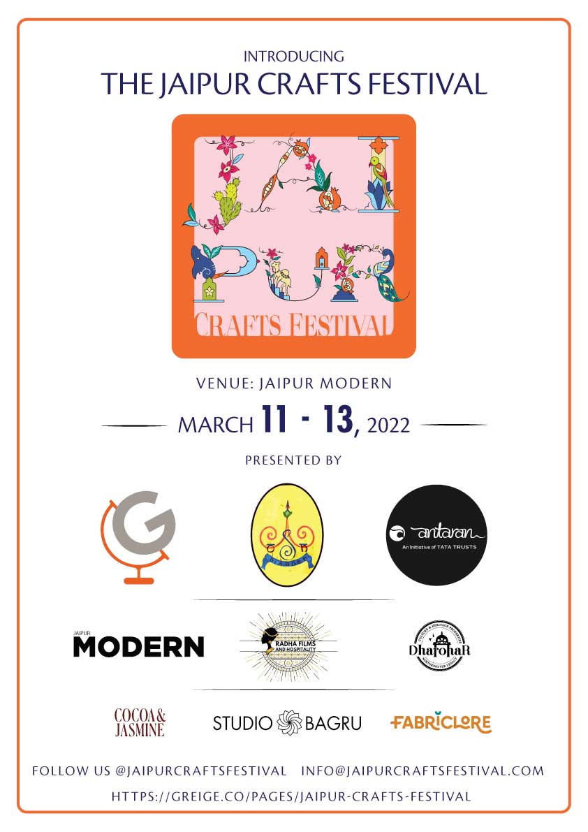 We proudly announce the first Jaipur Crafts Festival with a focus on restoring lost and endangered crafts. The festival premieres at Jaipur Modern on March 11-13, 2022. Time: 11 AM to 7 PM.